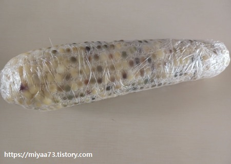 냉동한 옥수수를 끓는 물에 다시 삶아서 데워드시는 분들도 있는데요. 그 방법보다는 지퍼팩에 담아 데우는 것이 더 좋더라고요. 끓는 물에 또 삶으면 오버쿡 되어 알맹이가 터져서 손에 붙어 끈적거리고 식감이 떨어집니다.